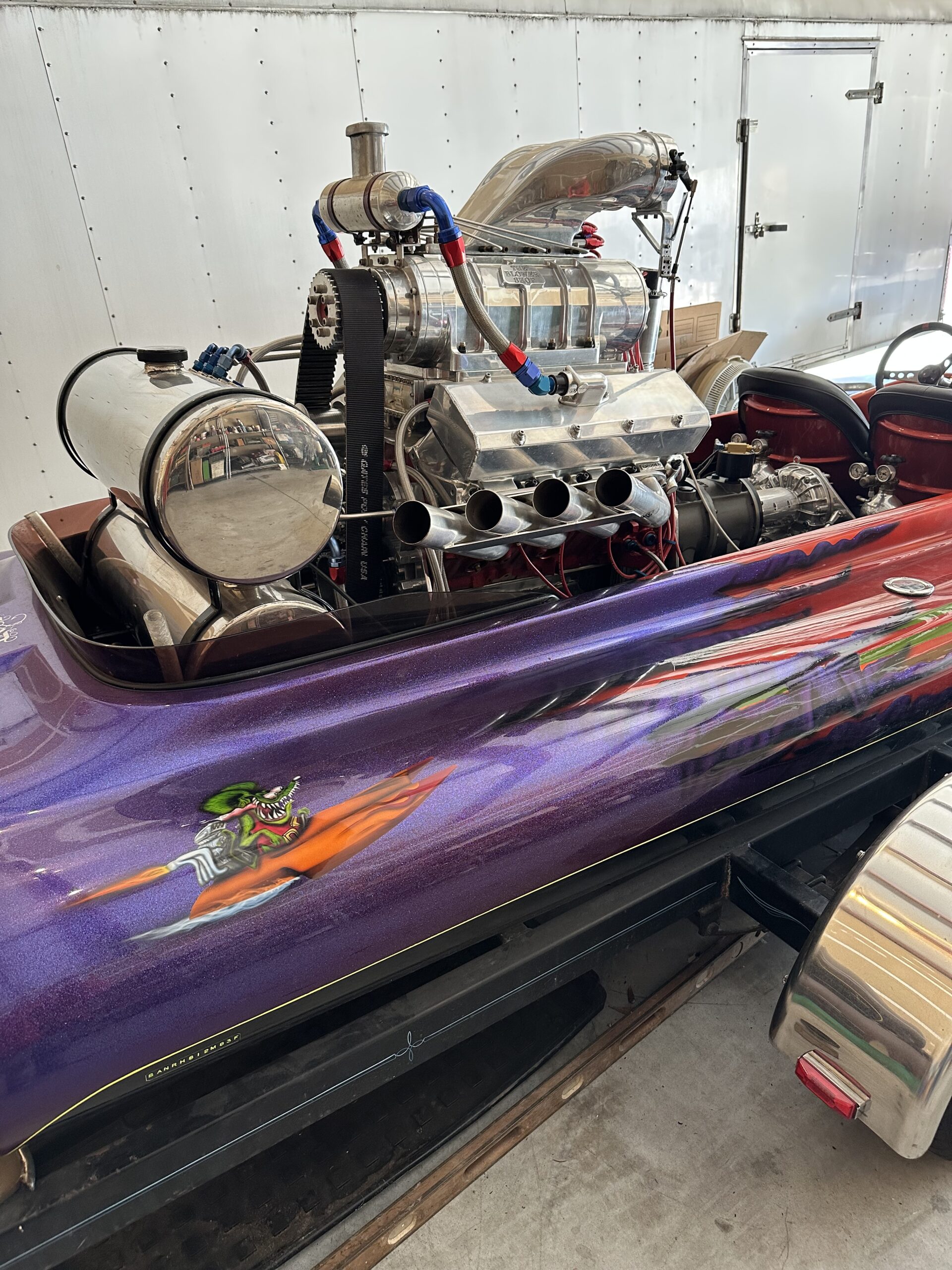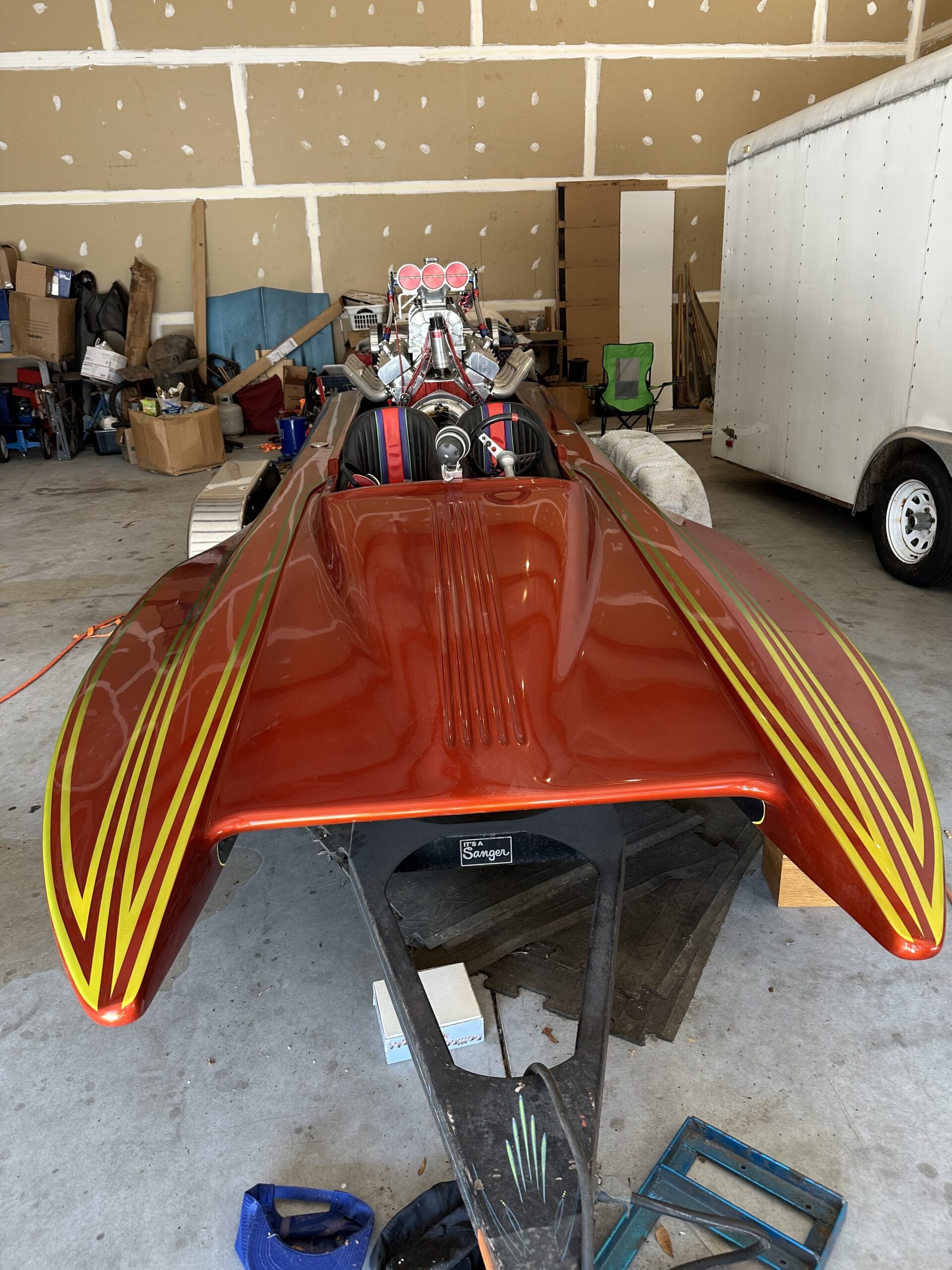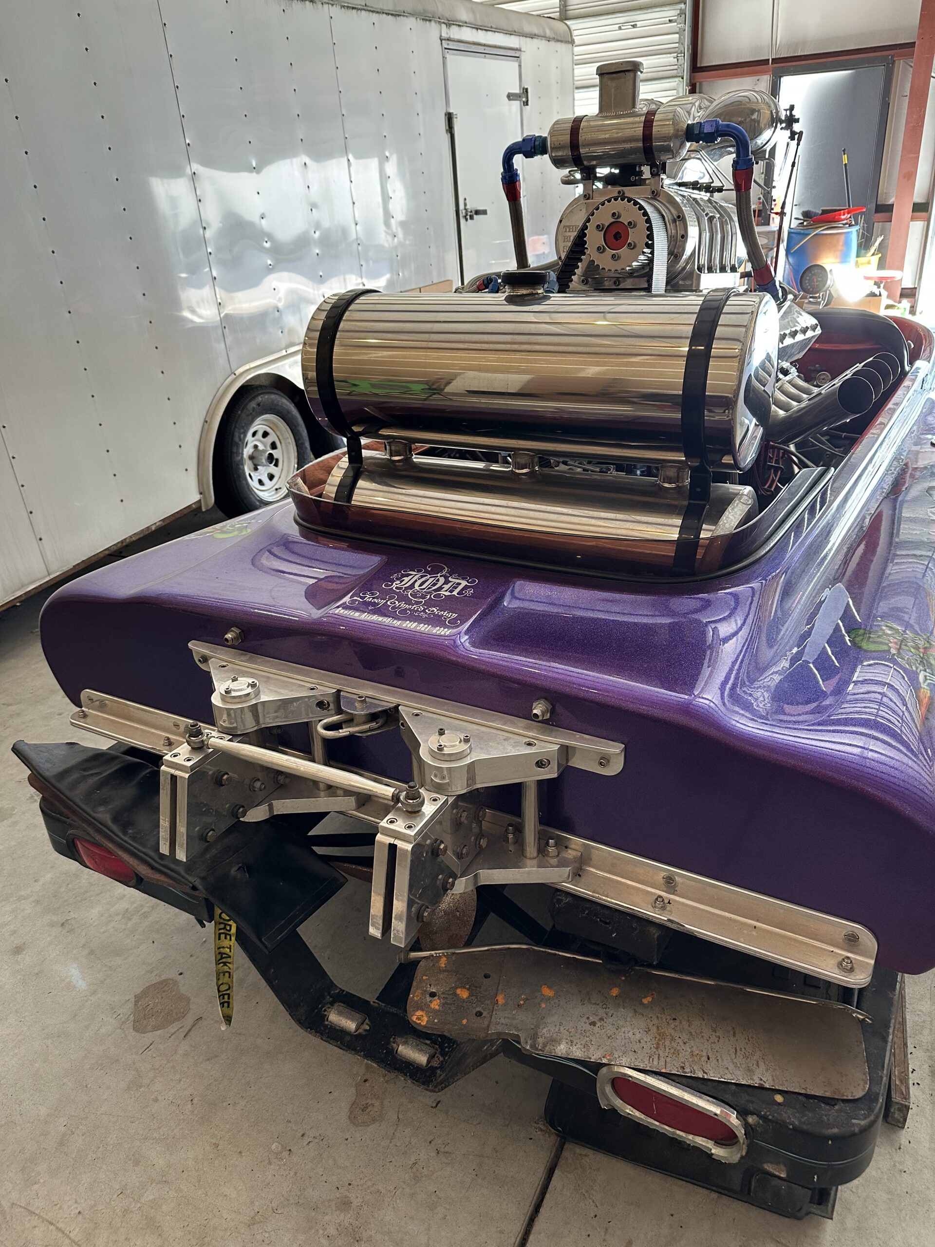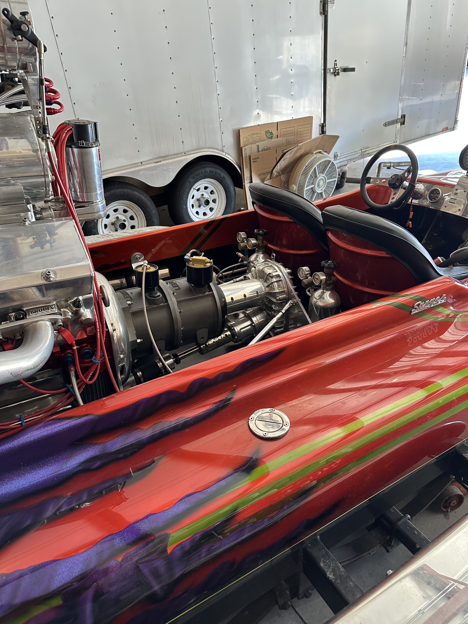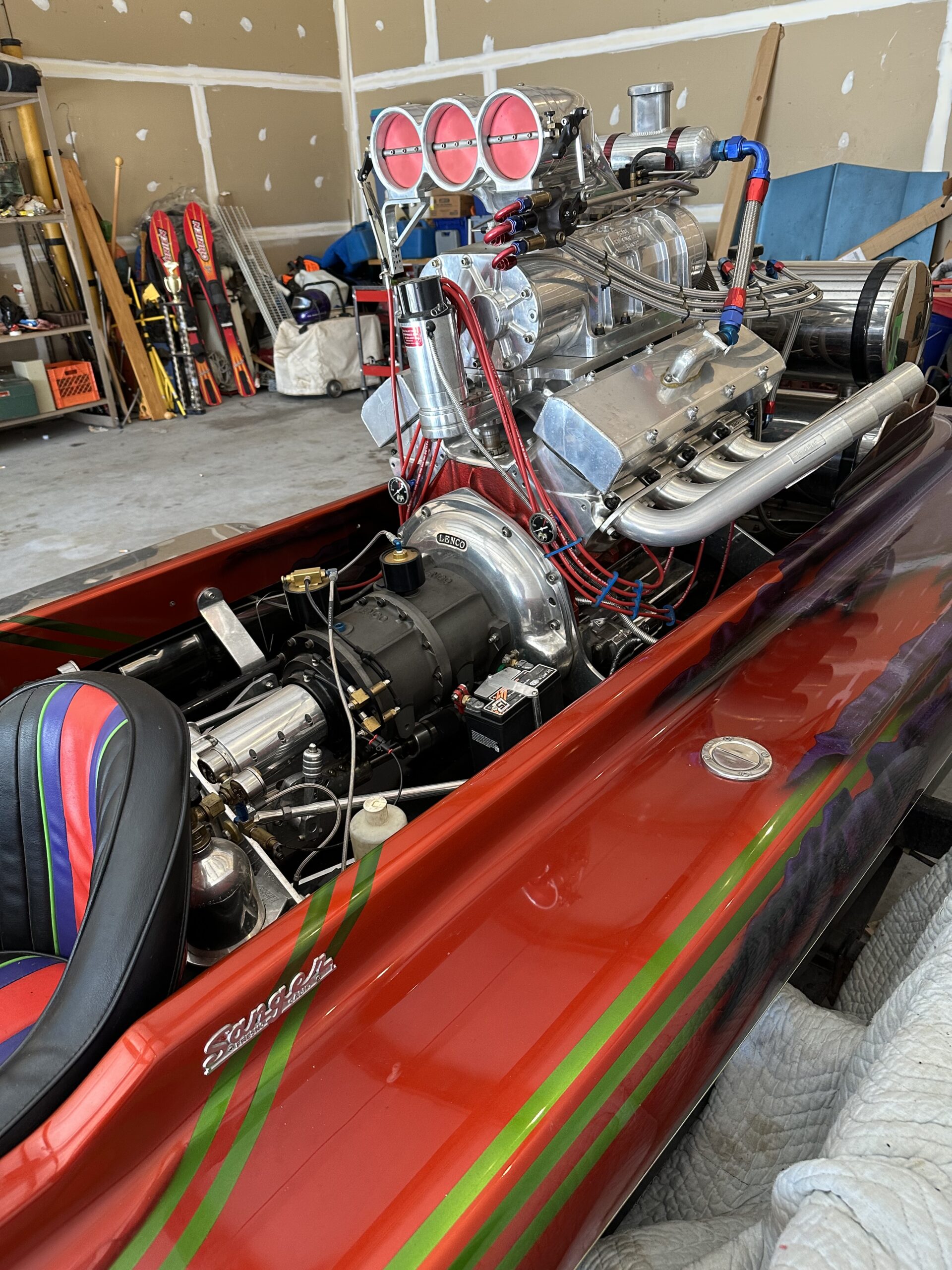 This boat is an exceptional Lake Boat. Dual outboard clams and rudders. Custom stack fuel tank. Water cooled alcohol BBC 482. Block is half filled. Flawless custom House of Color candy paint. Everything in the engine is brand new as well and can be converted to gasoline. Boat has custom work cover